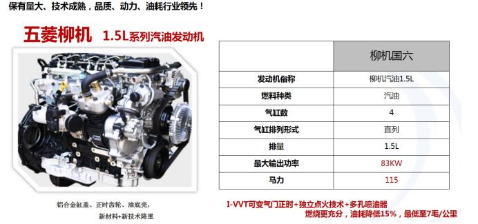一、動力總成出眾:采用柳機1.5L發動機,低速大扭矩,配合蒙沃5檔變速箱,性能穩定,傳動效率高。
