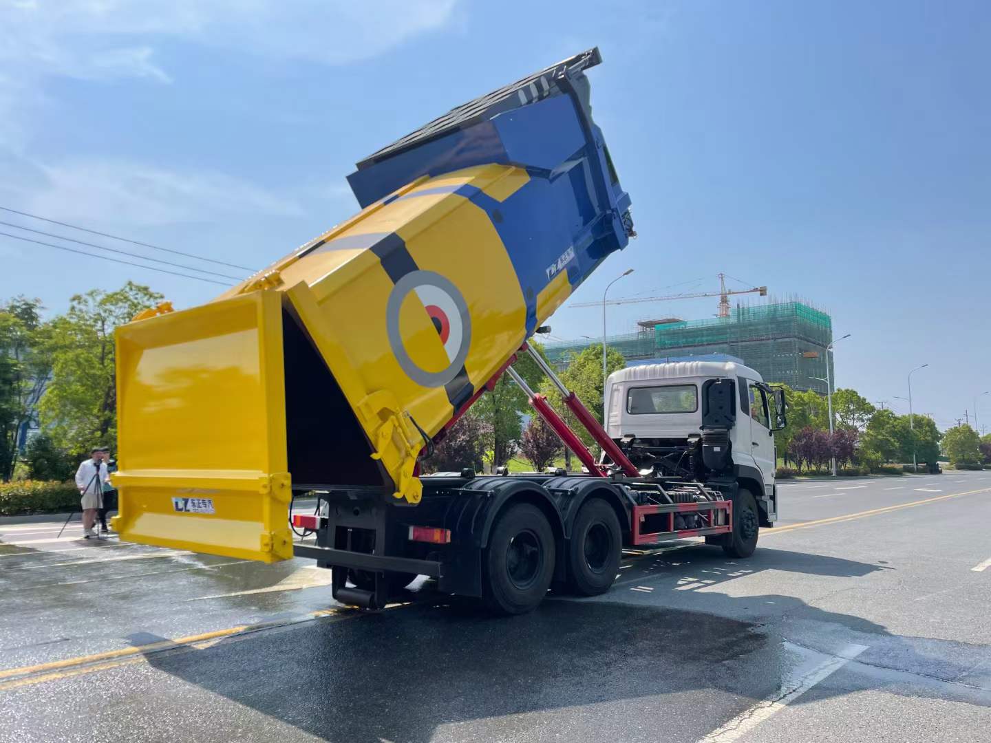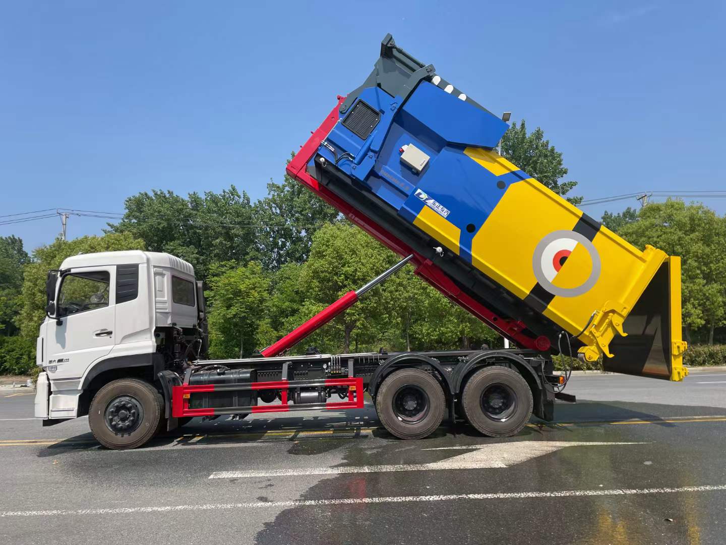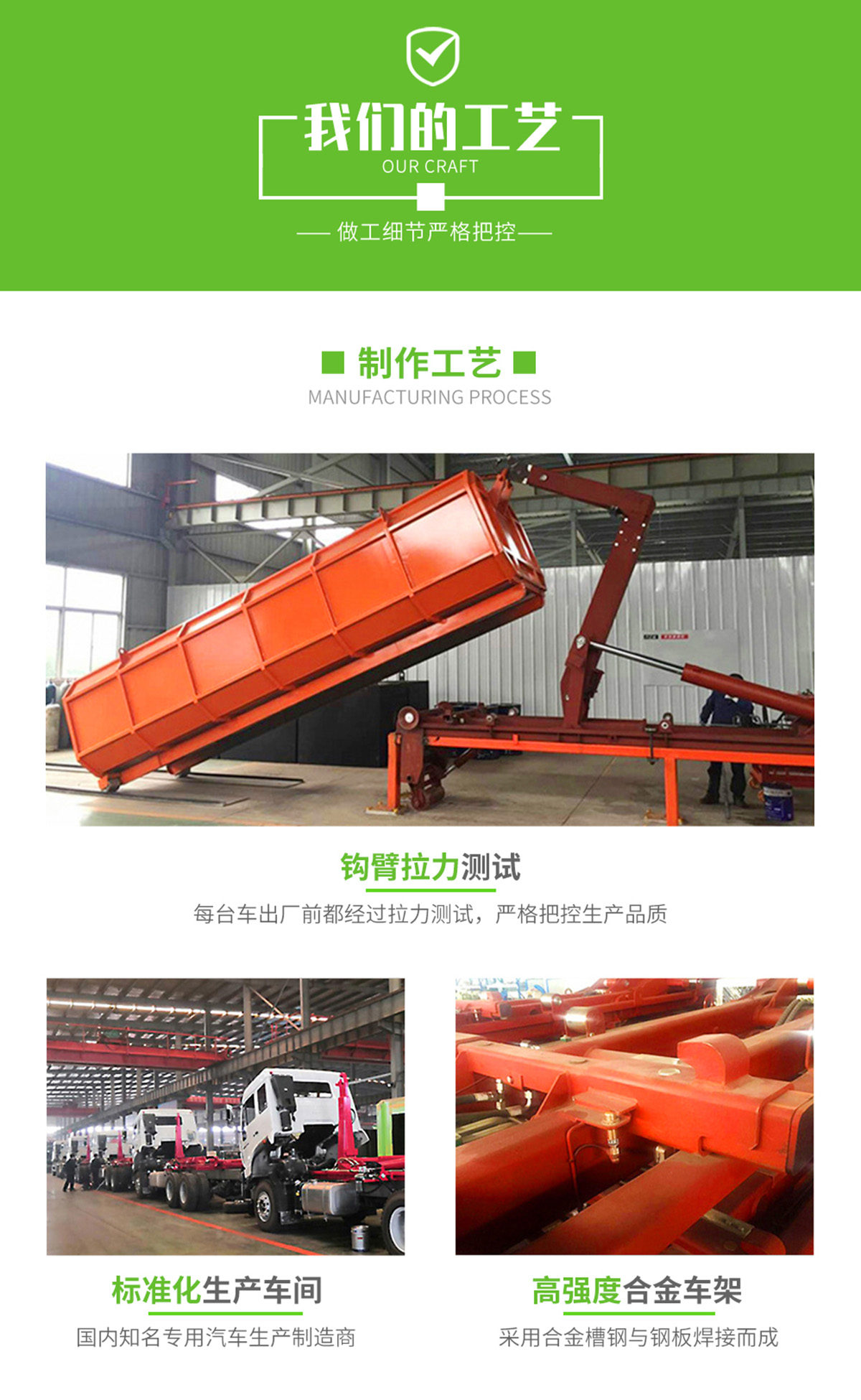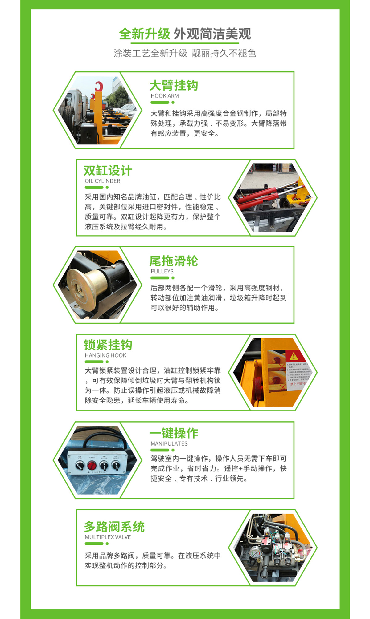 上裝配置:由液壓系統、操作系統、拉臂,組成。舉升油制缸為國內知名液壓件廠家生產的雙作用油缸,多路閥液壓控制,操作員手動控制垃圾廂吊上放下,帶自卸功能,上下一次工作循環時間≤40S。標配帶液壓油箱,滑輪,液壓多路閥,拉臂油缸,鎖緊油缸,液壓油過濾器,液壓油泵,液壓表等部件組成。選配液壓支腿。