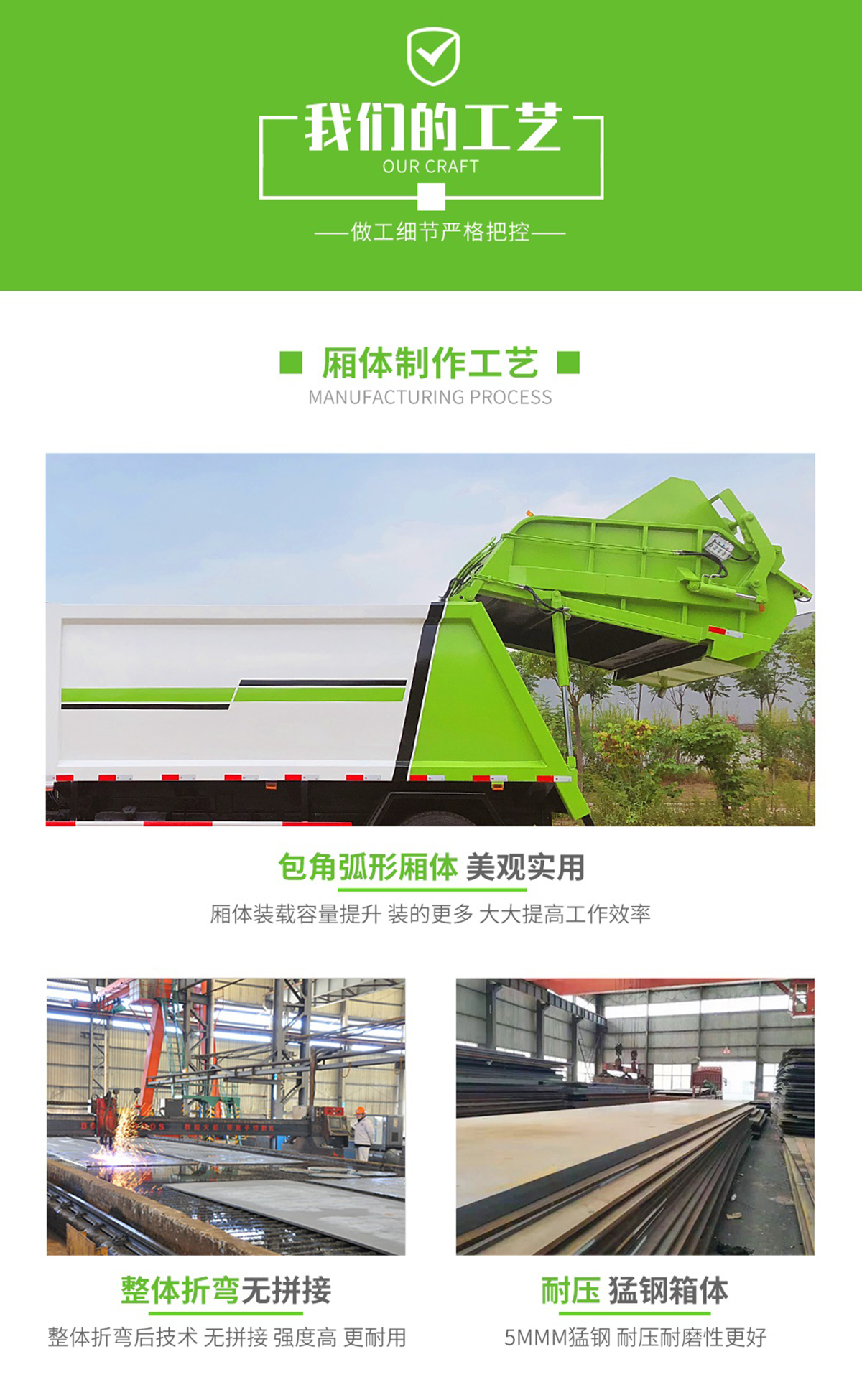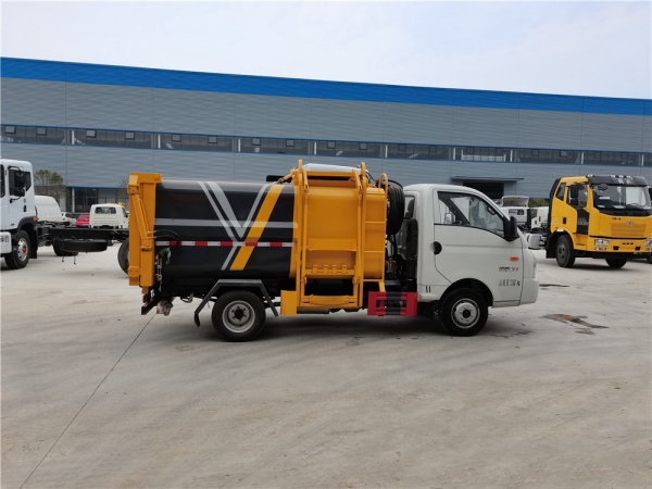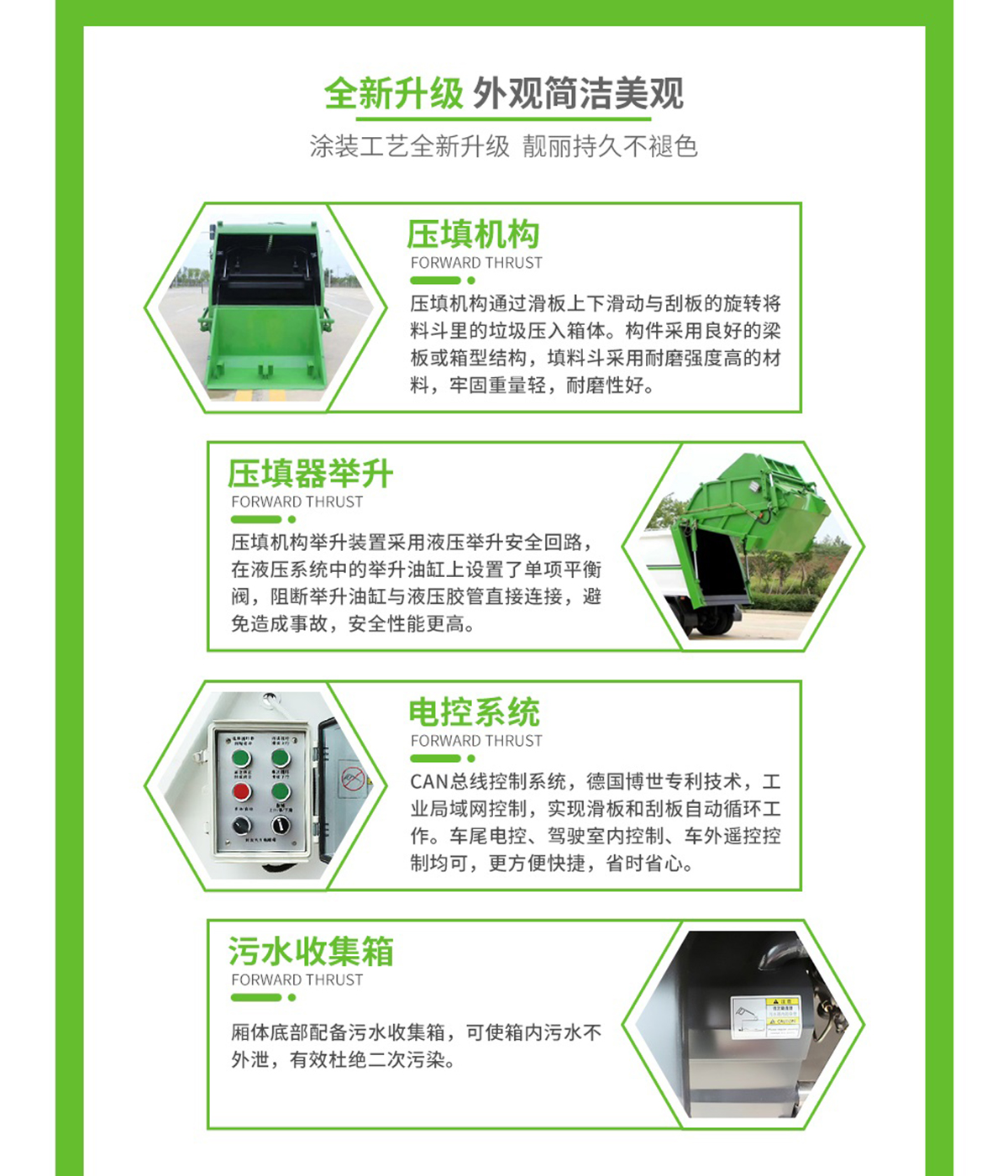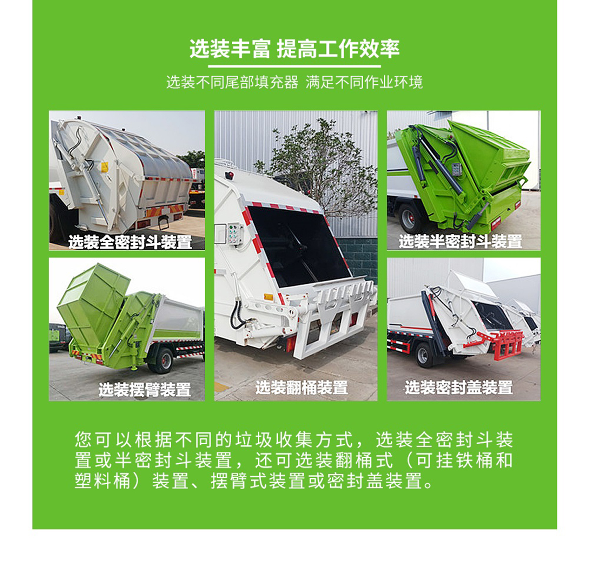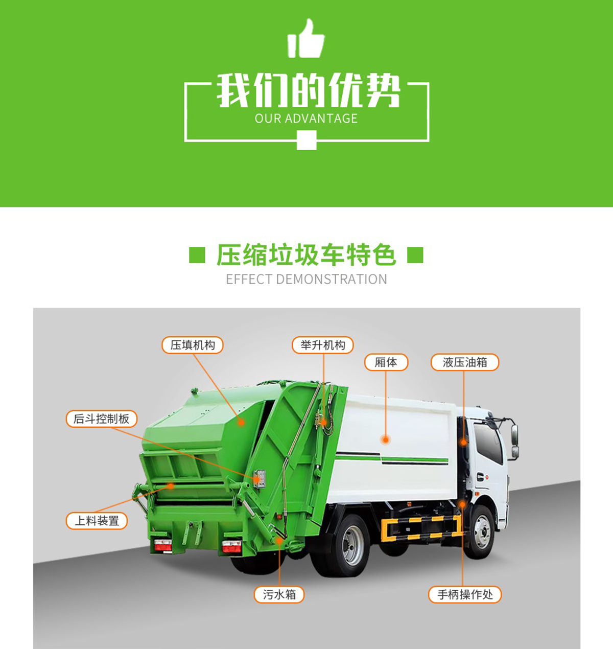 上裝配置:廂體有效容積約4立方米,側(cè)裝掛桶提升機(jī)構(gòu),可定制提升120L或240L垃圾桶,內(nèi)帶全推板,尾部液壓開啟。