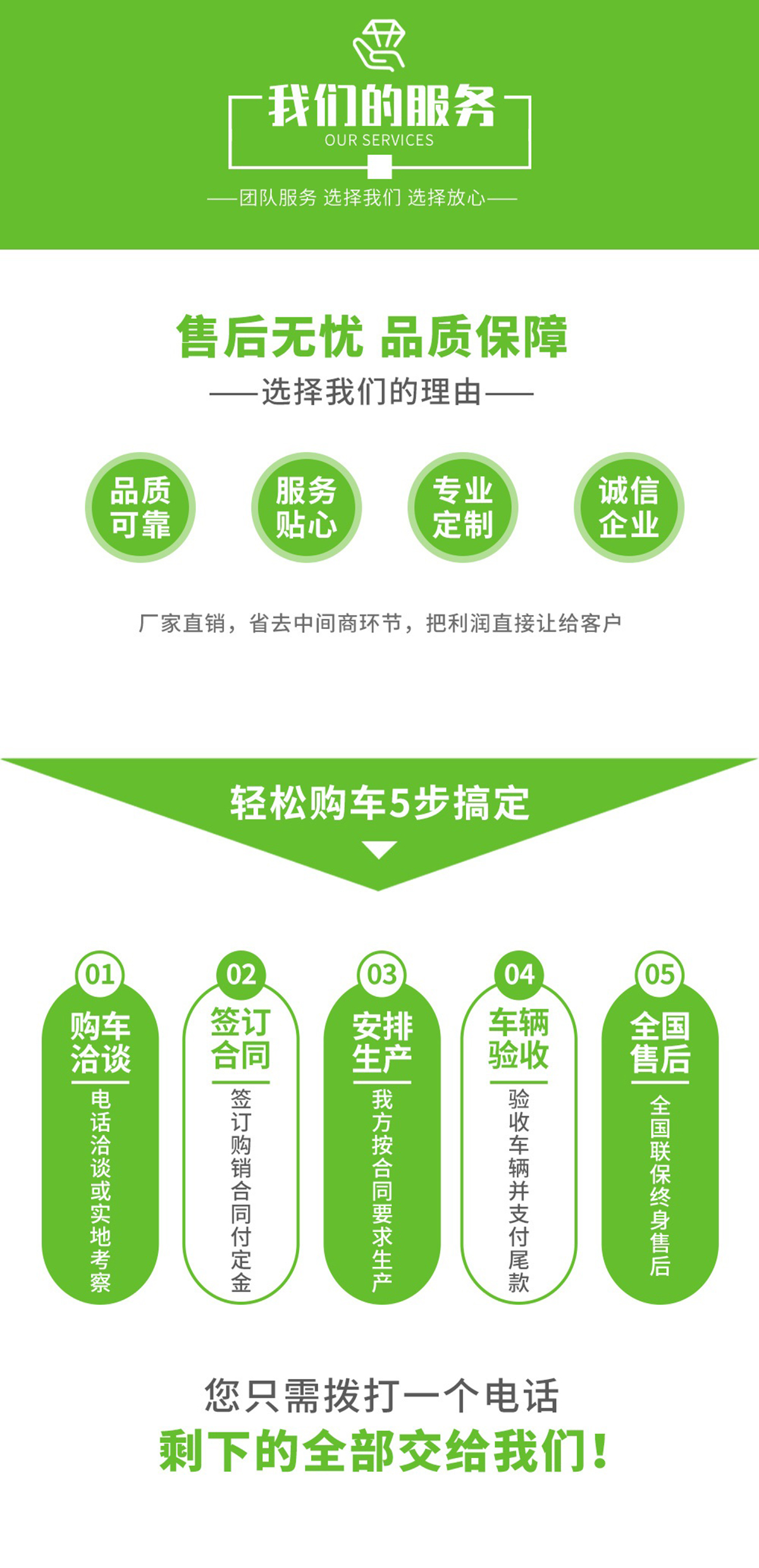·創(chuàng)優(yōu)質(zhì)服務(wù)企業(yè); 造用戶滿意產(chǎn)品; 樹國內(nèi)知名品牌!公司堅(jiān)持以“質(zhì)量求生存、信譽(yù)求發(fā)展、科技創(chuàng)新路、服務(wù)創(chuàng)品牌”的經(jīng)營理念,以“誠信、務(wù)實(shí)、創(chuàng)新、進(jìn)取”為企業(yè)宗旨,不斷提升自身產(chǎn)品質(zhì)量,開發(fā)適應(yīng)市場需求物美價(jià)廉的多功能專用汽車! 我們將謁誠為您提供更好、更快、更優(yōu)質(zhì)的服務(wù)!