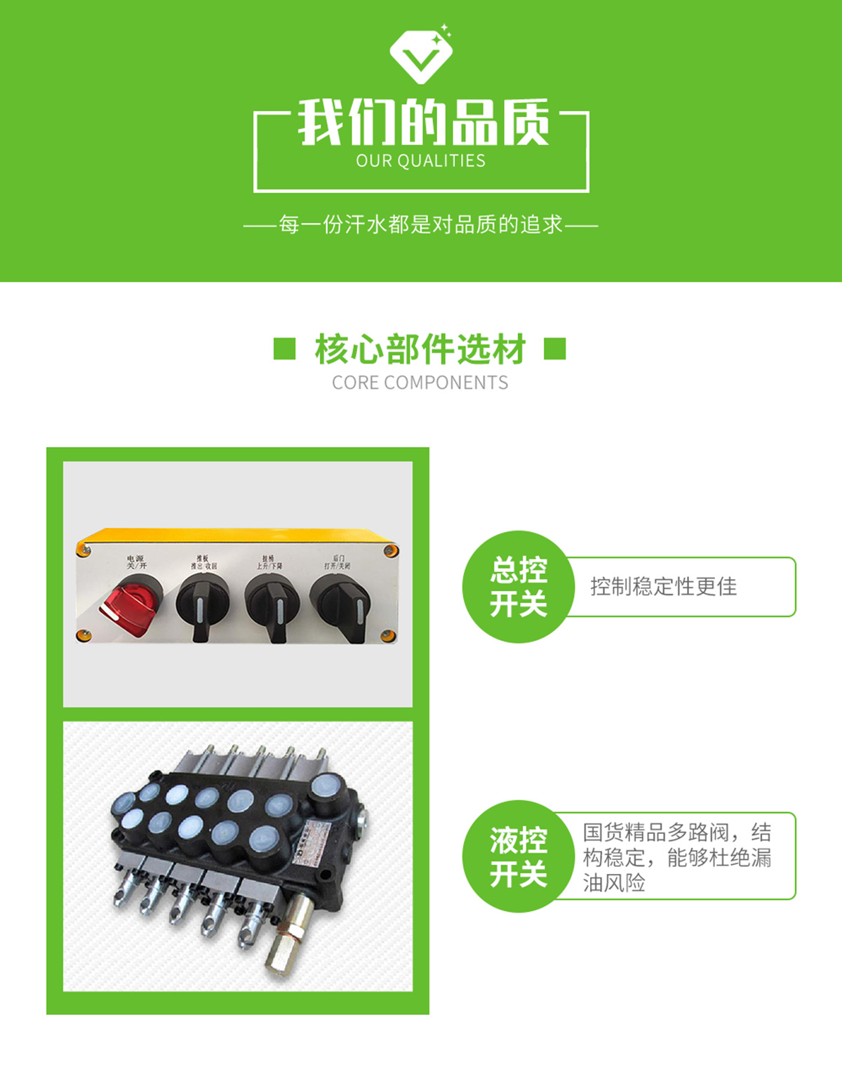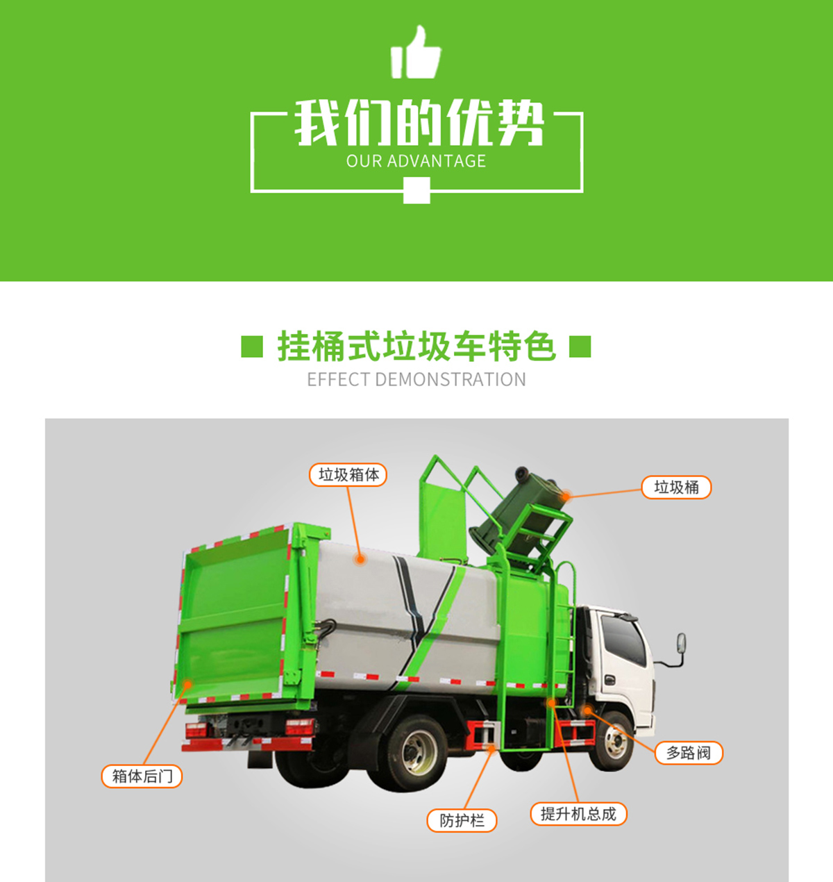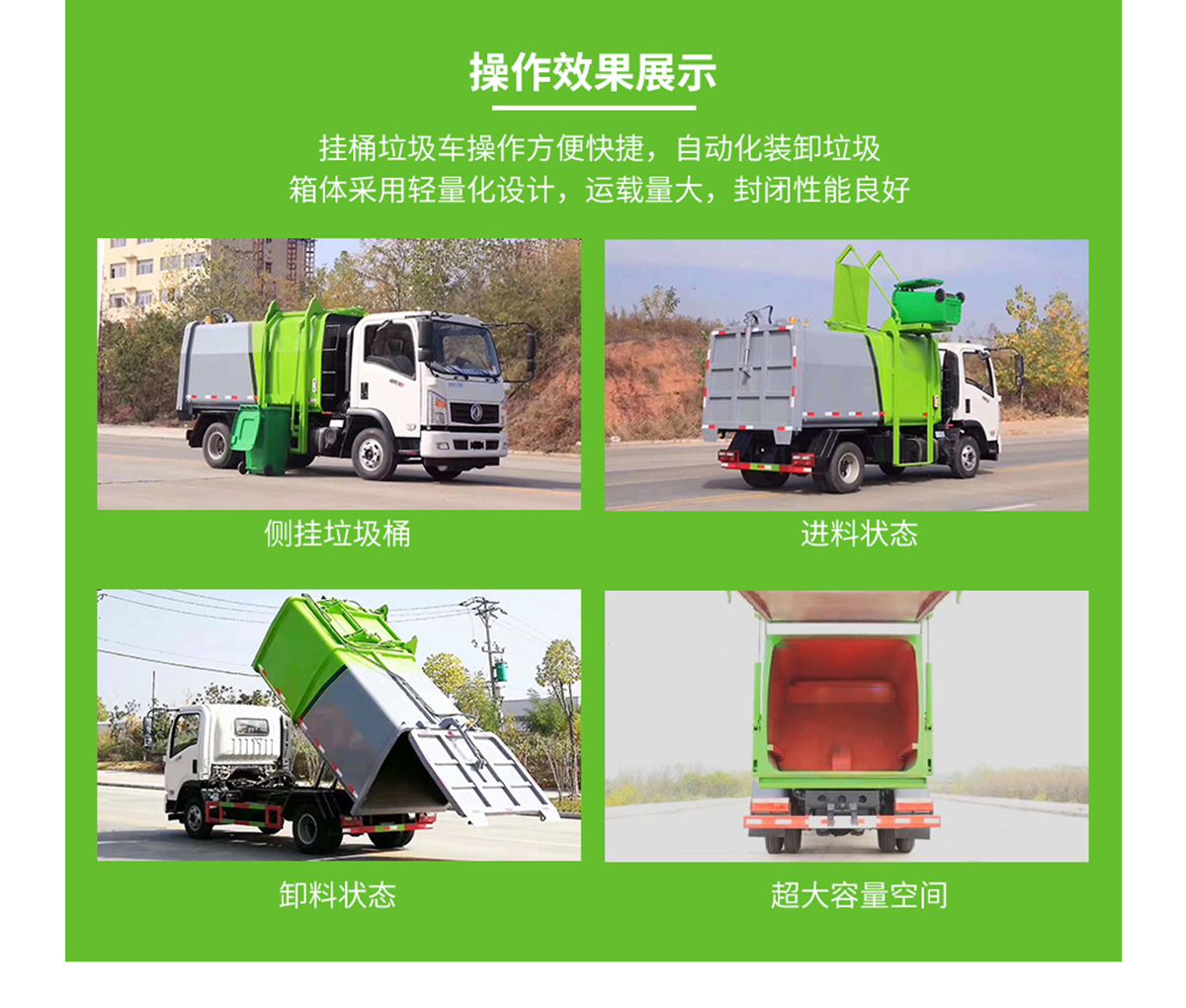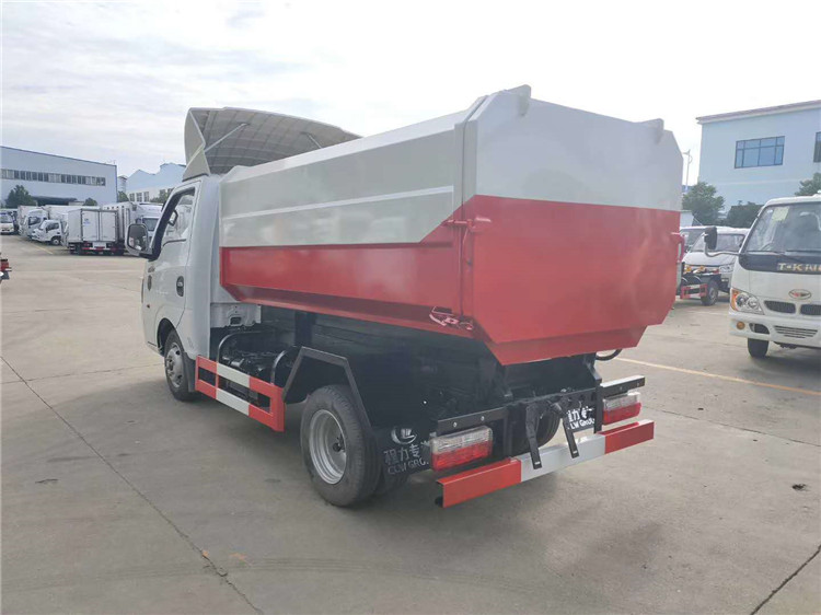 自動舉升垃圾桶倒入垃圾,提升機頂部帶機械翻蓋,箱體底部雙液壓舉升自卸,箱體后部設(shè)有擋水槽,尾部裝有橡膠密封條,防污水滴漏。