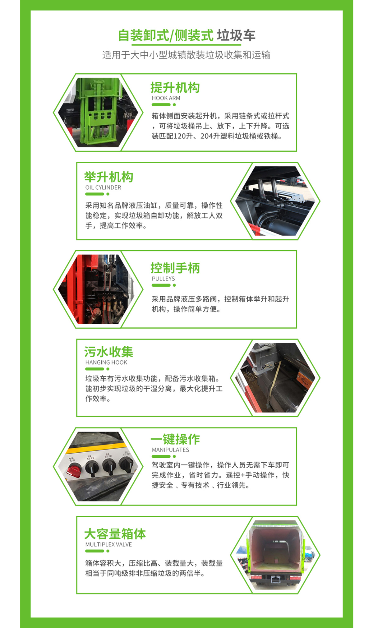 通過副駕一側(cè)的提升機,將240L塑料垃圾桶垃圾提升至垃圾收集口,實現(xiàn)對垃圾的裝載及卸料作業(yè)功能;